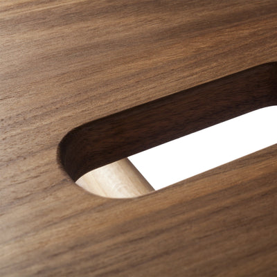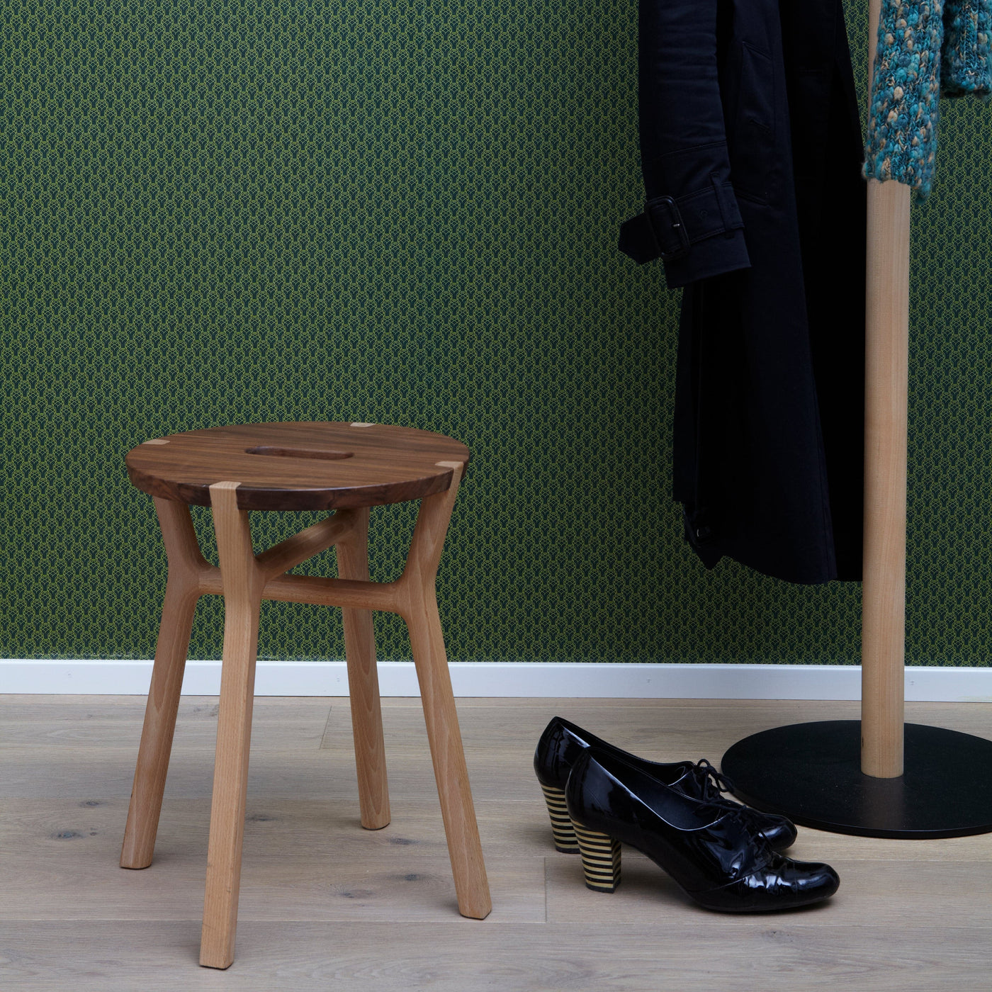 Affi is a stool that was designed by Giulio Iacchetti and comes in solid walnut or beech wood. It features a circular top with a slight opening in the middle, four legs, and a decorative criss-cross wood section under the seat.