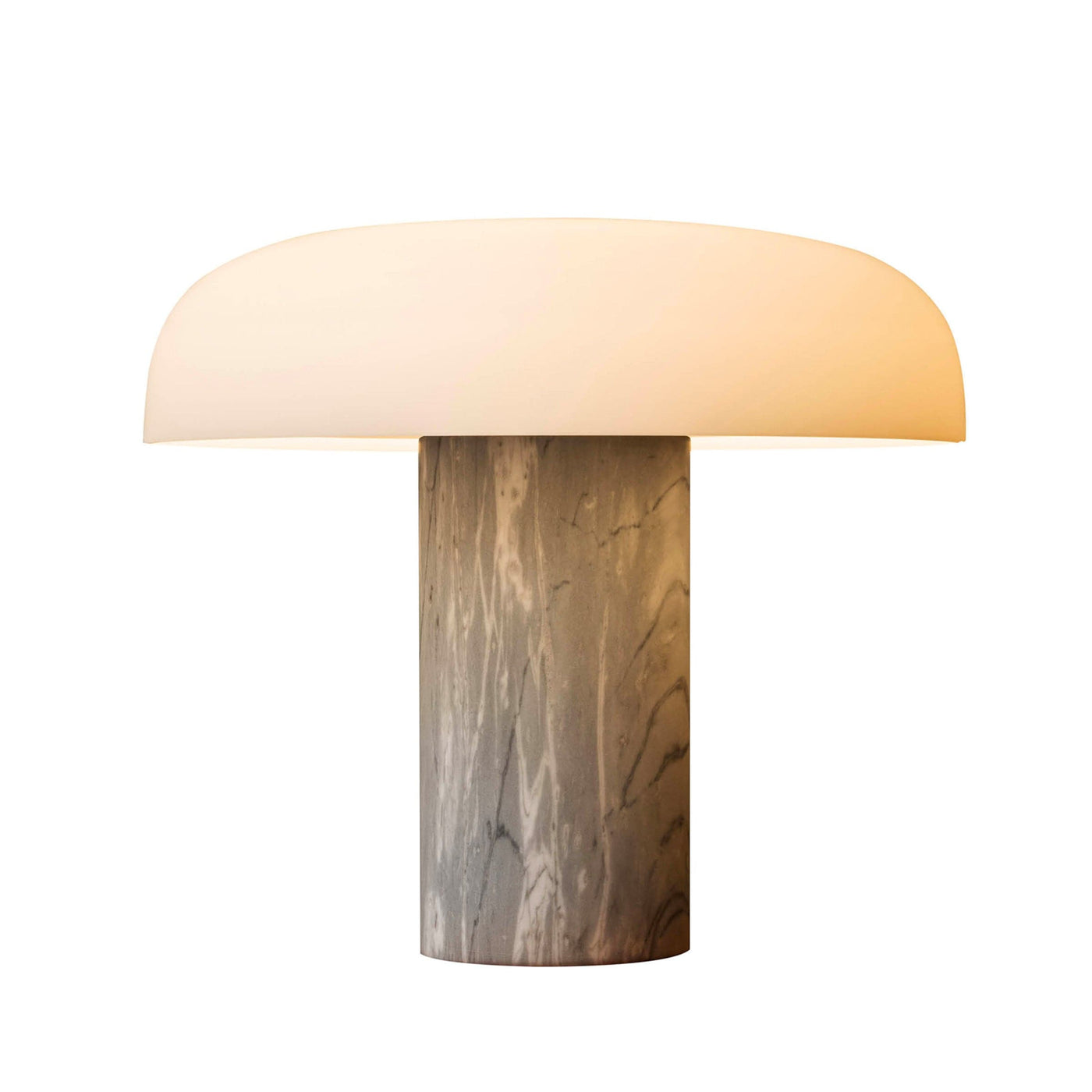 Diffused and dimmable light. Body available in white Carrara, grey Bardiglio or black Marquinia marble. Diffuser in etched opaline blown glass. On the Bardiglio grey and Marquinia black models, the button is in black nickel-plated metal; it is gold-coloured on the Carrara white model. Black power cable, dimmer and plug. Power supply with interchangeable plug. Integrated LED.